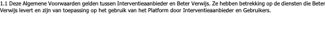 1.1 Deze Algemene Voorwaarden gelden tussen Interventieaanbieder en Beter Verwijs. Ze hebben betrekking op de diensten die Beter Verwijs levert en zijn van toepassing op het gebruik van het Platform door Interventieaanbieder en Gebruikers.